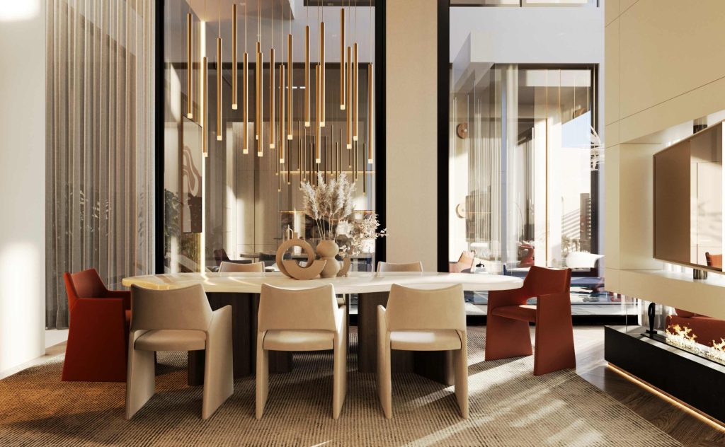 Mr. Eid Villa blends modern elegance with comfort. A mix of wood, concrete, and glass shapes the sleek design. The foyer features wood paneling, art, and bold flooring. Living spaces offer plush seating, natural light, and stylish décor. Bathrooms use marble, wood, and greenery. Neutral tones with color pops enhance calm. Landscaping adds a minimal, fresh touch.