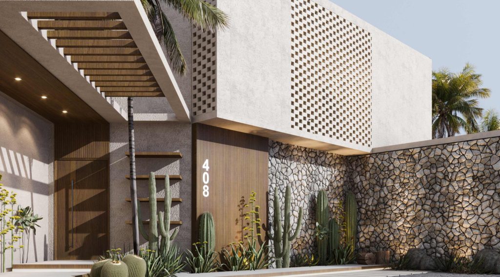 A modern villa defined by clean geometric volumes and a balanced mix of stone, wood, and soft neutral finishes. Perforated screens add privacy and visual depth, while the layered entrance and desert-inspired landscaping create a warm, elegant, and contemporary exterior character.
