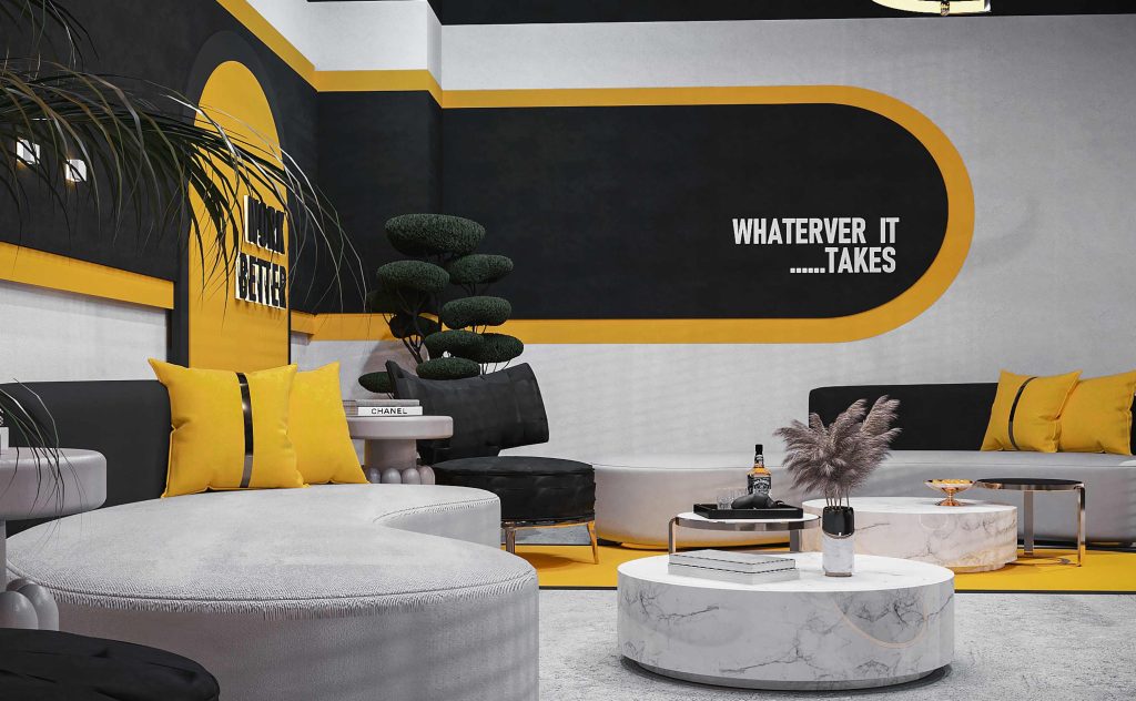 Padel Club offers a modern space for padel lovers, blending vibrant black, gray, and yellow tones. Glass courts, cozy lounges, motivational quotes, and stylish décor enhance the experience. Facilities include quality courts, relaxation zones, and office spaces, promoting fitness, leisure, trust, and community.
