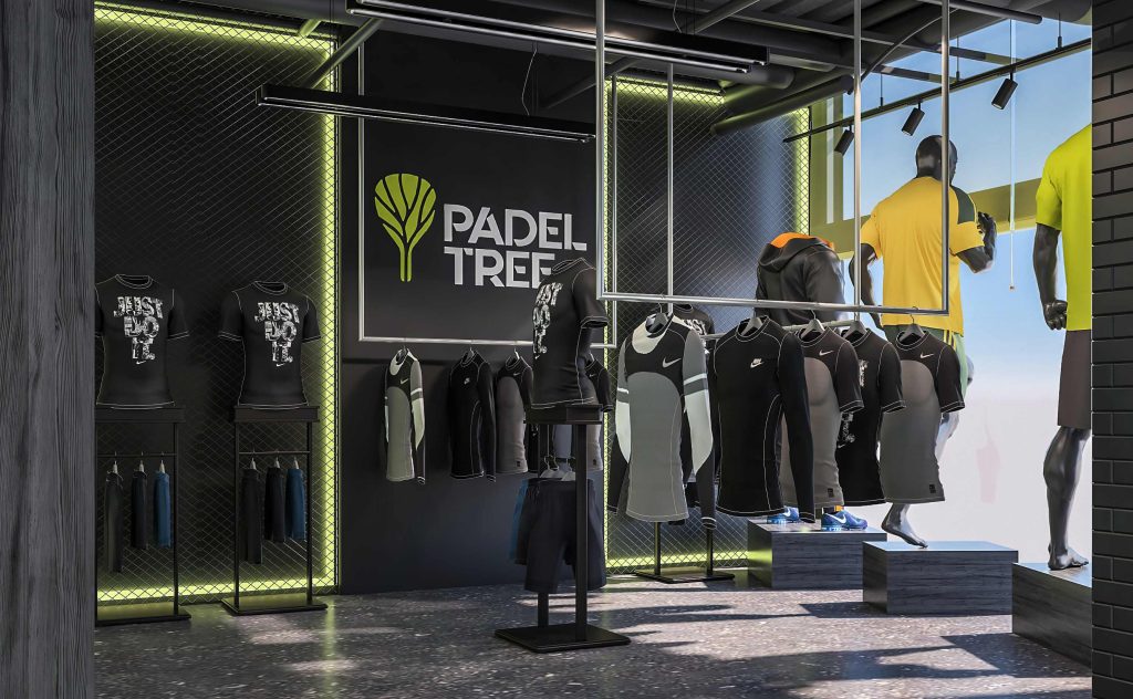 Padel in at Al Bahrain Club features a sleek, modern design with concrete and marble finishes, bold branding, and green accents. The interior combines minimalistic furniture, clean lines, and an open layout. Vibrant murals and a dynamic color scheme—blue courts and red flooring—enhance energy, while stylish lighting adds warmth and depth.