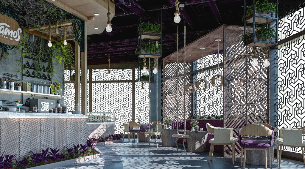 Vamos Café & Bakery features a modern, earthy design with concrete textures, wooden furniture, and lush greenery. Geometric patterned screens filter natural light,casting artistic shadows that enhance the space. Hanging plants, rope lighting, and purple accents add warmth and vibrancy, creating a cozy, stylish atmosphere ideal for relaxing and socializing.